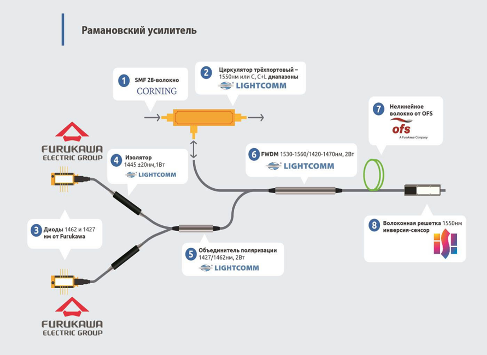 - Накачка осуществляется на длинах волн 1427 и 1462нм. Диоды компании Furukawa сделаны специально для ВКР усиления. Серия FOL14xx предлагает любые длины волн в диапазоне от 1400 до 1500нм и выходную мощность до 600мВт, а также встроенную стабилизацию по длине волны, термо-электрический контроллер и изолятор для защиты от обратного излучения.