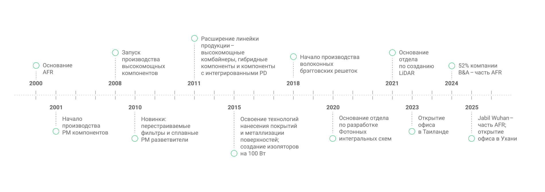 Компания AFR (Advanced Fiber Resources) основана в 2000 году в Чжухае в Китае и является ведущим поставщиком пассивных оптических компонентов, предназначенных в основном для телекоммуникаций, волоконных лазеров и волоконных датчиков. AFR разрабатывает и производит передовые и экономичные пассивные и активные оптические компоненты на высокотехнологичном предприятии, сертифицированном по стандарту ISO 9001 и ISO 14001. Основная задача AFR – стать для своих клиентов №1 при выборе высокомощных компонентов и компонентов с сохранением поляризации и продолжать развиваться как на китайском, так и мировом рынке оптических технологий и фотоники.