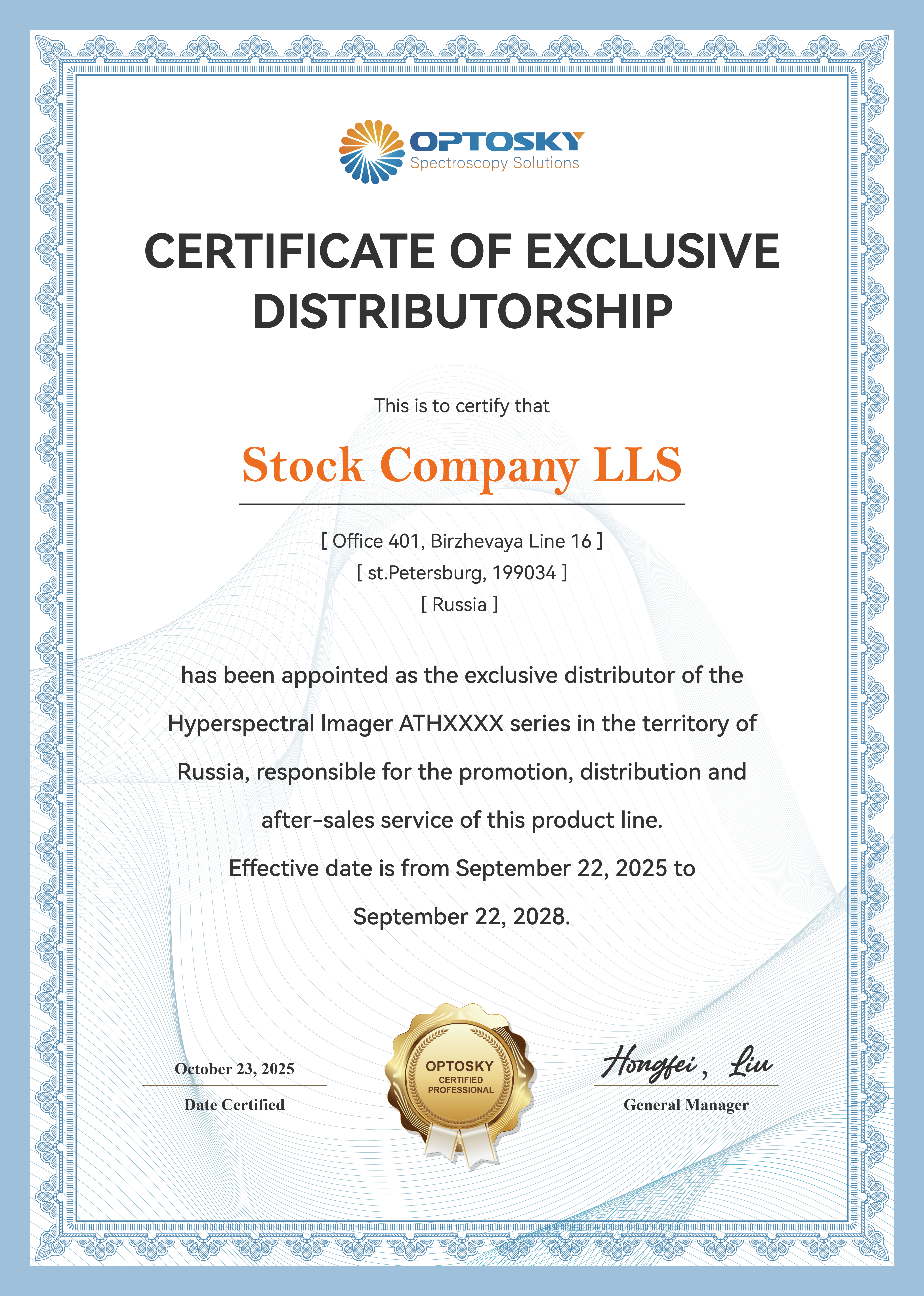 В рамках партнёрства АО «ЛЛС» будет отвечать на территории России за продвижение, дистрибуцию и полное послепродажное обслуживание передовых гиперспектральных камер Optosky.