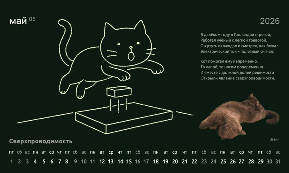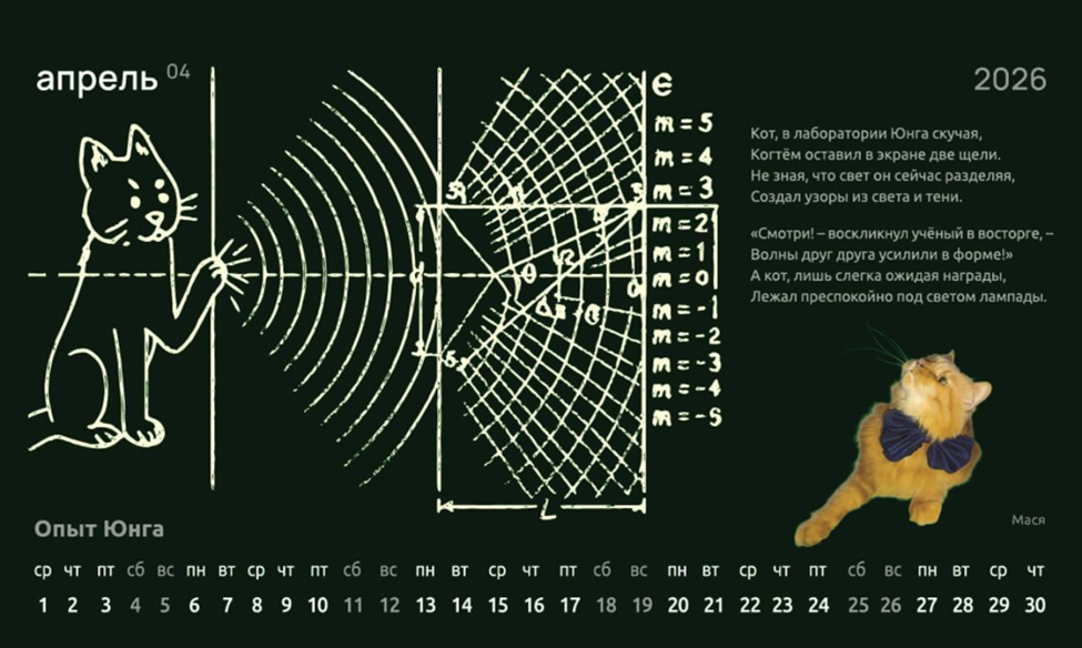Этот календарь продолжает «кошачью» традицию АО «ЛЛС» и рассказывает альтернативную историю науки глазами кота‑наблюдателя – символа компании. Каждый месяц посвящён реальному открытию или эксперименту в области физики, оптики и фотоники, а сюжеты сопровождаются стихотворными научными справками, которые делают сложные концепции ближе и понятнее. Иллюстрации выполнены в стиле меловых рисунков на доске, будто кот формулирует гипотезы прямо в аудитории, а акцент сделан не только на результате, но и на процессе — ошибках, случайностях и роли наблюдателя.