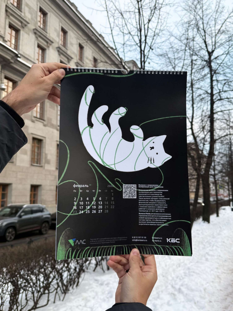 «Хроники лаборатории» – настенный календарь чёрно‑зелёной гаммы, в котором кот Шрёдингера исследует мир лазерного и оптического оборудования АО «ЛЛС». На 12 страницах маскот меняет воплощения: сидит на лазере собственного производства, запутывается в оптическом волокне, заглядывает в держатель оптики и даже появляется в образе Манэки‑нэко на анализаторе спектра Anritsu – отсылка к азиатскому вектору развития и партнерствам компании. Ручная графика художника‑дизайнера и краткие техописания превращают календарь одновременно в арт‑объект и инструмент визуализации экспертизы «ЛЛС».