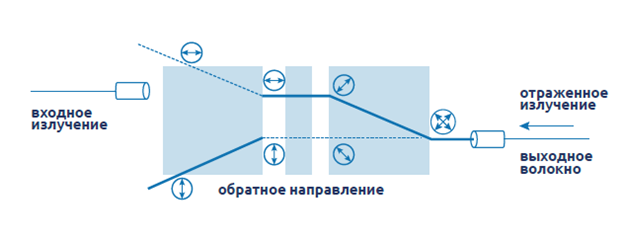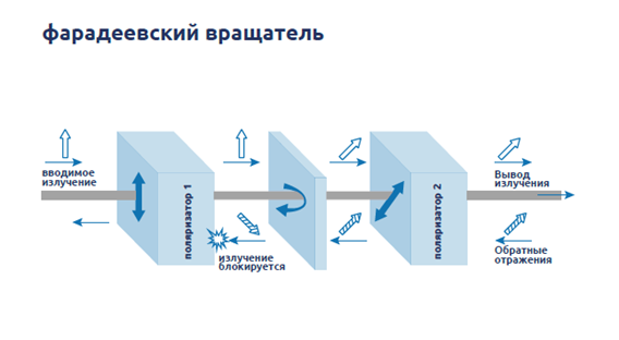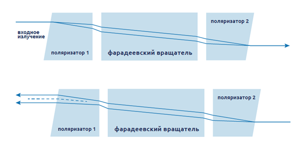 Основная функция изолятора – пропускать излучение в прямом направлении и не допускать распространения в обратном. Данный элемент защищает компоненты в линии от обратных отражений, которые могут быть выведены из строя даже при небольшой мощности. Таким образом, при прохождении излучения через фарадеевский вращатель поляризационная составляющая поворачивается на угол 45, на который настроен второй поляризатор. При распространении обратного излучения, направление поляризации поворачивается еще на 45 ° во вращателе Фарадея, так что этот свет будет заблокирован на входном поляризаторе или может быть выведен через отдельный порт.