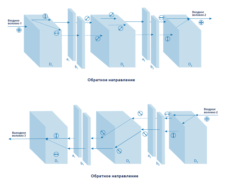 В случае не чувствительных к поляризации волокон, фарадеевский вращатель, на основе кристалла YVO4(ортованадата иттрия) вначале разделяет поляризационные составляющие, а затем снова собирает их на втором поляризаторе.