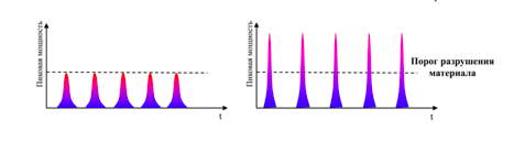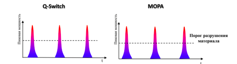 Рисунок 2 – Сравнение пиковой мощности лазеров Q-switch и МОРА при высоких и низких частотах: а) низкая пиковая мощность (ниже порога разрушения); б) высокая пиковая мощность, короткая длительность импульса.