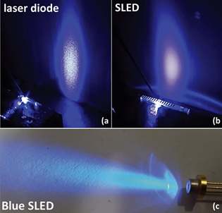 Сравнение спекл-шума в дальнем поле: (a) синий лазерный диод (b) синий SLED серии VISIBLESRGB (c) пучок из 5.6 мм синего SLED в TO-корпусе. |