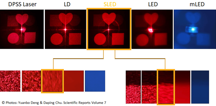 Из сравнения хорошо видно, что SLEDы достигают низкого контраста спеклов (слева), что связано с их широким спектром излучения (низкой временной когерентностью). В свою очередь, SLEDы достигают высокой четкости изображения (справа) благодаря высокой пространственной согласованности.