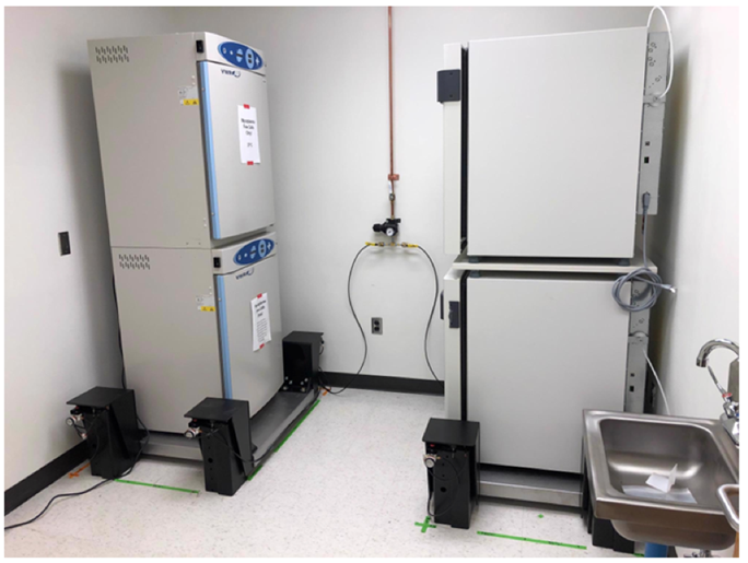 В данном случае два инкубатора были установлены друг на друга и размещены на специальной виброизолирующей платформе. В основе её работы лежат подвесные воздушные изоляторы поршневого типа, которые эффективно уменьшают передачу колебаний от пола, возникающих из-за работы окружающего оборудования.