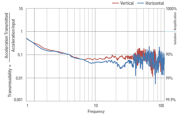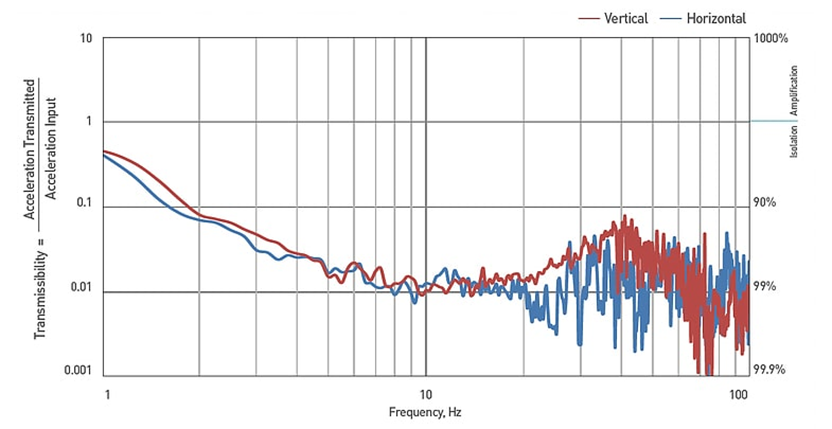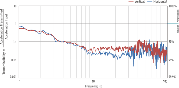 Наша активная система виброизоляции начинает снижать вибрации при 0,5 Гц, достигая 90% изоляции при 2 Гц.