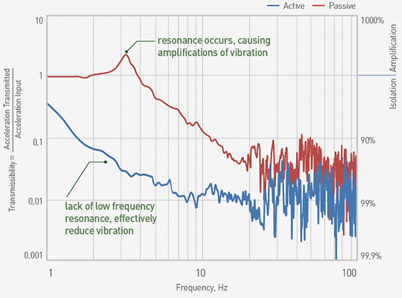 Активная система виброизоляции преодолевает этот недостаток за счет снижения собственной частоты системы до уровня ниже герца. Следовательно, активные системы виброизоляции не подвержены резонансу и могут эффективно снижать низкочастотные вибрации.