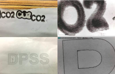 На рисунках приведены примеры маркировки, выполненной маркировщиками на основе волоконного (Fiber), СО2- и УФ (DPSS) лазеров на различных материалах.