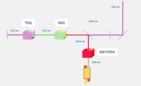 355 нм – длина волны излучения третьей гармоники твердотельного лазера. Ее генерация происходит по следующей схеме: источник накачки, диод с длиной волны 808 нм, создает инверсию населенности в кристалле Nd:YVO4, который излучает на длине волны 1064 нм. Его излучение попадает на нелинейный кристалл I, в котором возбуждается вторая гармоника (532 нм), затем излучение основной частоты смешивается с излучением второй гармоники на нелинейном кристалле II. В результате на выходе излучается третья гармоника.