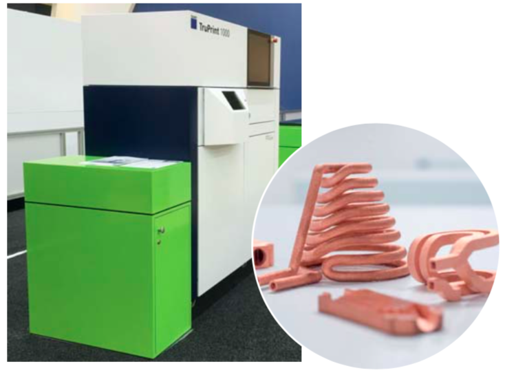 Рис. 4. SLM машина TruPrint 1000 c зеленым лазером компании Trumpf и образцы выращенных медных изделий [12].