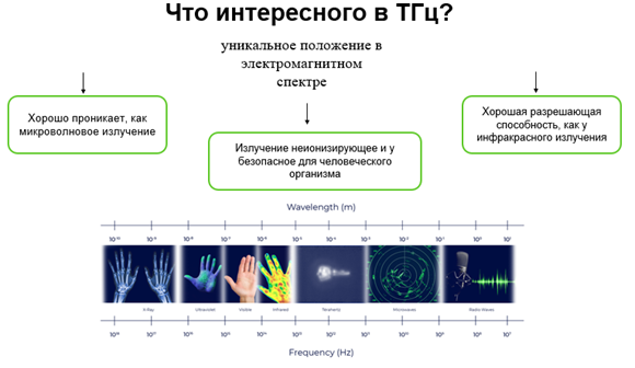 - Безопасность. Энергия ТГц-кванта очень мала (в тысячи раз меньше, чем у рентгеновских лучей). Она недостаточна для ионизации атомов и молекул, а значит, не разрушает биологические ткани и ДНК, в отличие от рентгена.