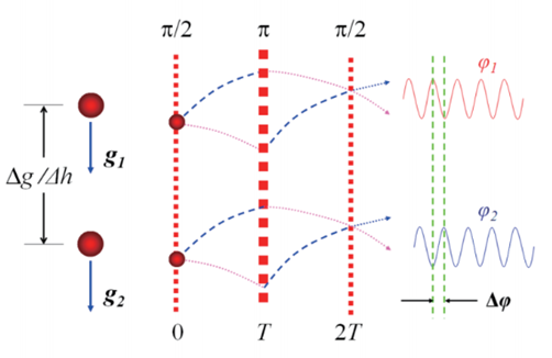 Градиент силы тяжести – это пространственная скорость изменения ускорения свободного падения. Он имеет чрезвычайно важное научное значение и перспективы применения в таких областях, как разведка полезных ископаемых, геофизика и исследования окружающей среды, а также в автономной навигации. Атомный градиентометр силы тяжести основан на использовании двухатомных гравиметров, расположенных вертикально или горизонтально, для измерения значения градиента силы тяжести. Основной принцип заключается в том, что с помощью лазеров осуществляется манипуляция интерференцией квантовых состояний атомов, и значение градиента силы тяжести получается путем вычисления фазового сдвига интерференционных полос, как показано на Рисунке 1.