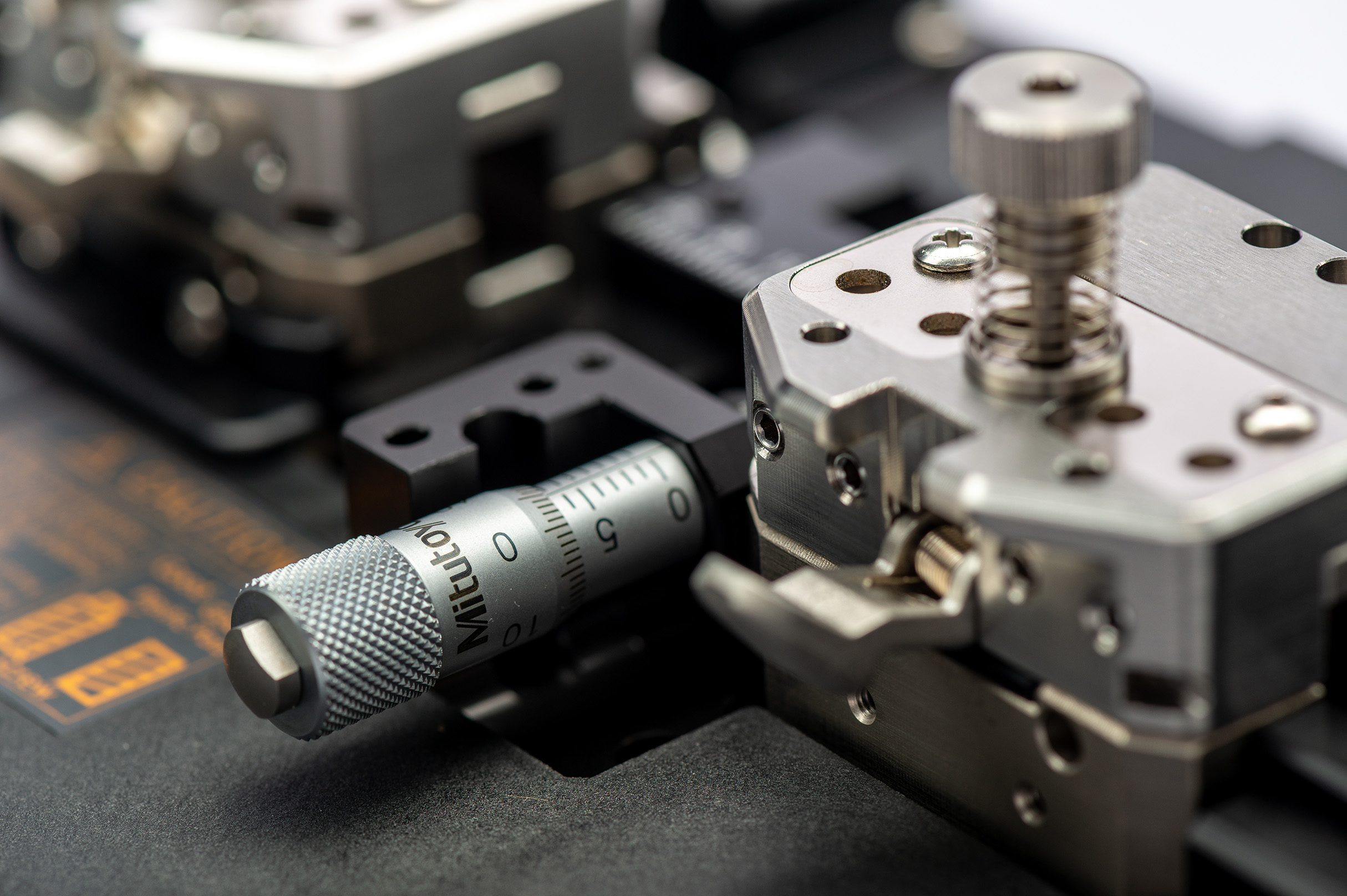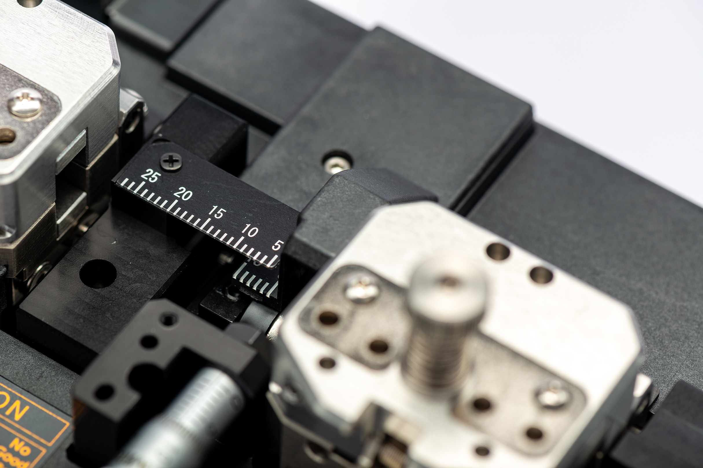 - Сменные вставки для разных диаметров и микрометрическая поддержка для толстых волокон.