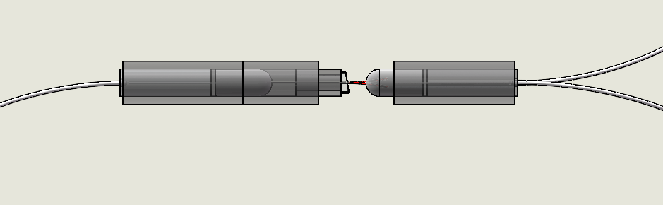 - Устанавливаются коллиматорные сборки в специальные держатели: с одной стороны волокно подключается к источнику излучения, а с другой - к приемнику, для отслеживания сигнала и экстинкции.